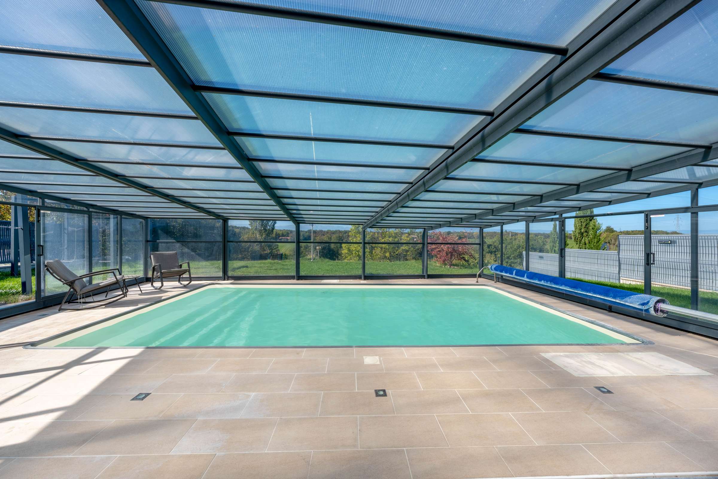 The magnificent 8x4 meter swimming pool, equipped with a sliding roof and an outdoor shower, will allow you to fully enjoy the sunny days. Built in 2011 on a plot of 1478 m², this property benefits from a clear view and offers several terraces to enjoy the surrounding green setting.