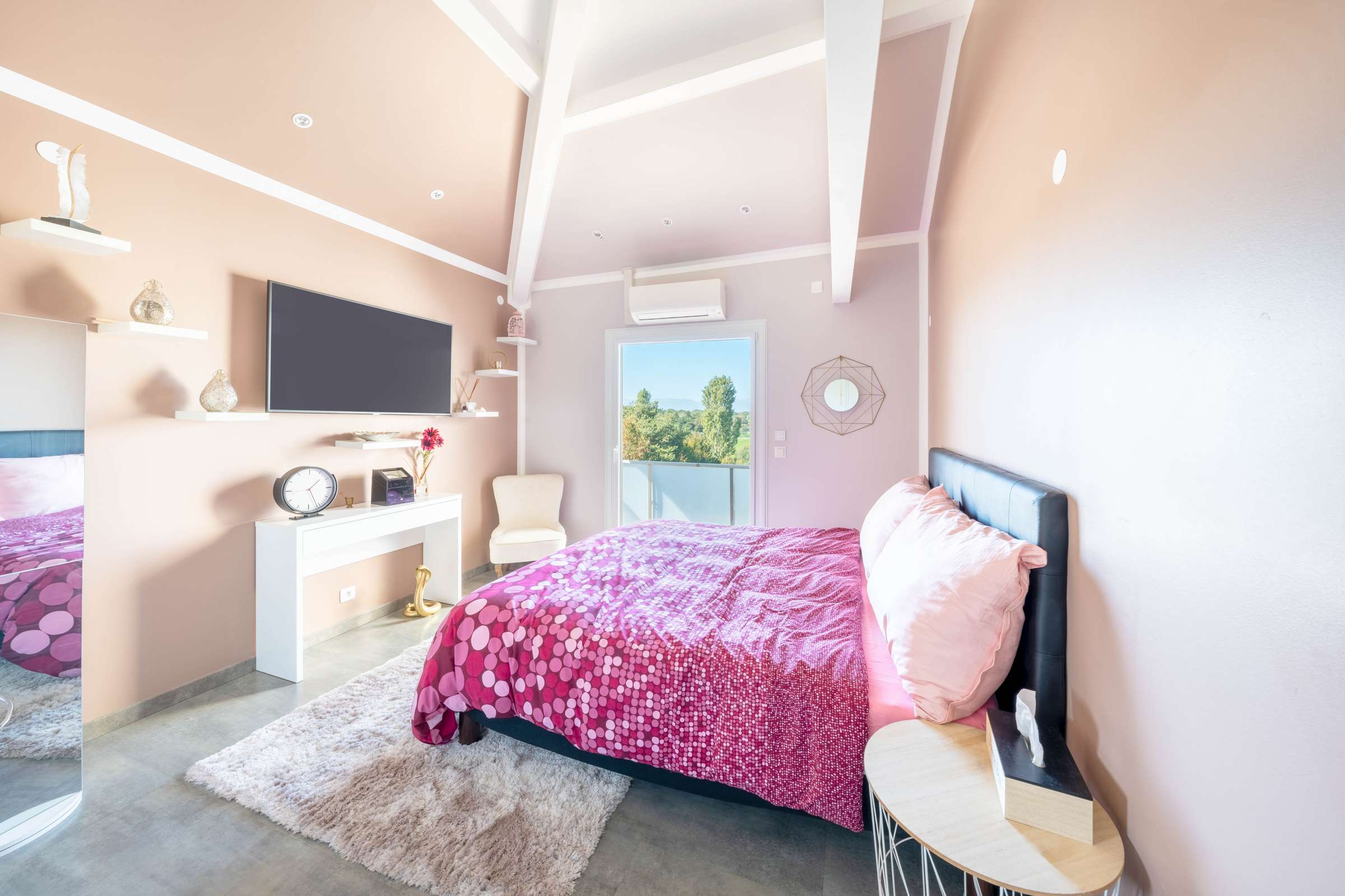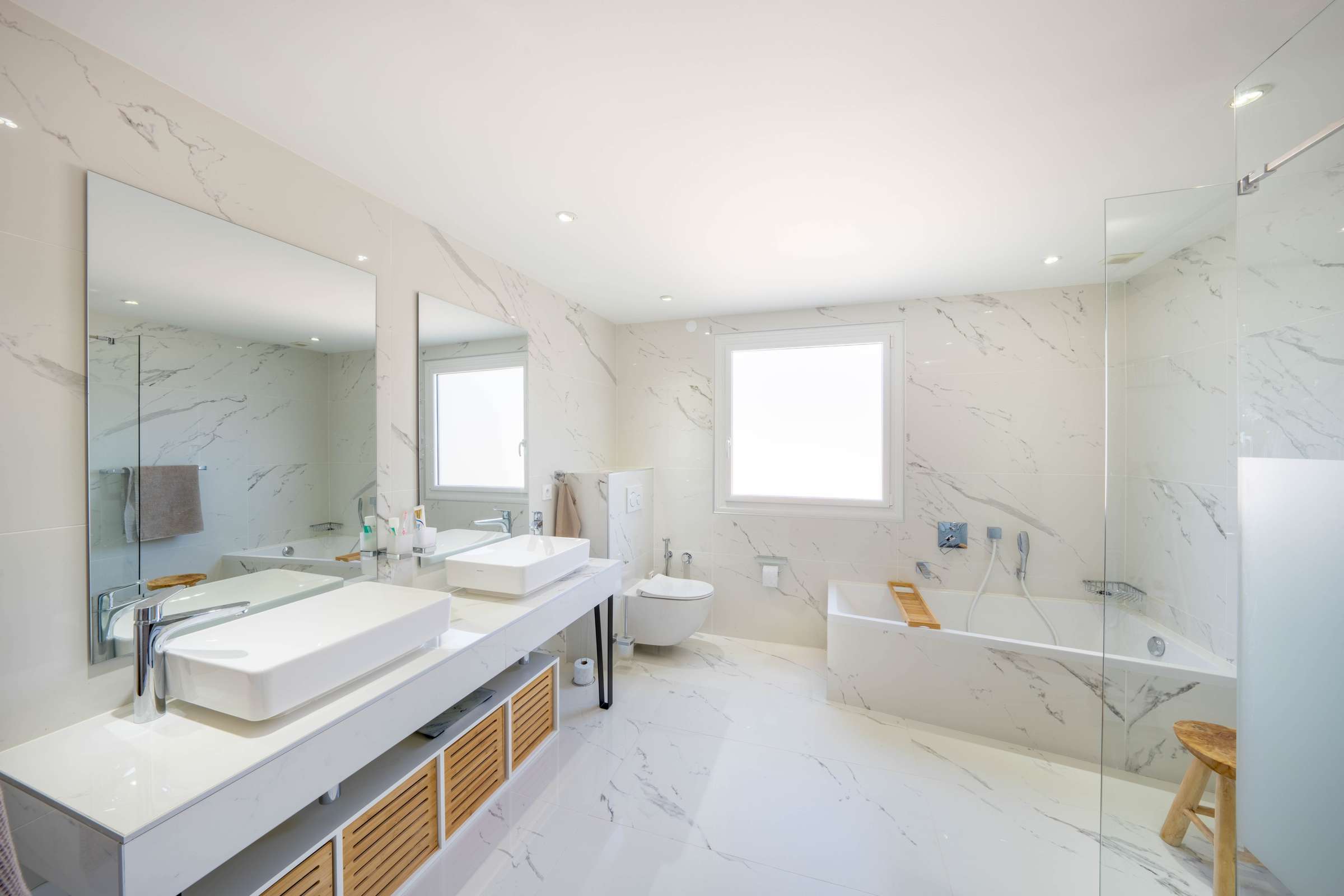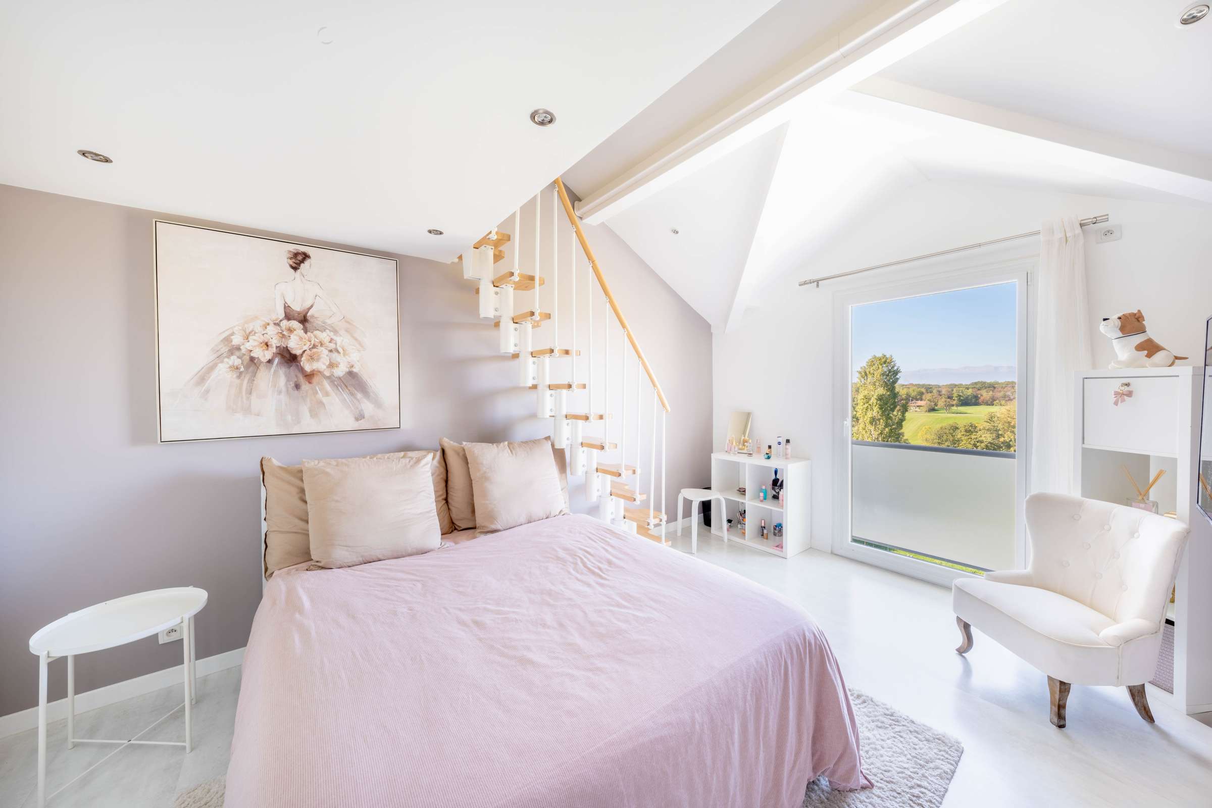 The ground floor has an entrance hall, WC visitors, a spacious fully equipped kitchen opening onto a large living-dining room with fireplace leading to a beautiful terrace with a breathtaking view of the Jura, a master suite with private bathroom and dressing room. Two beautiful bedrooms with mezzanine, an office space, a large bathroom with bathtub, shower and toilet complete the 1rst floor.