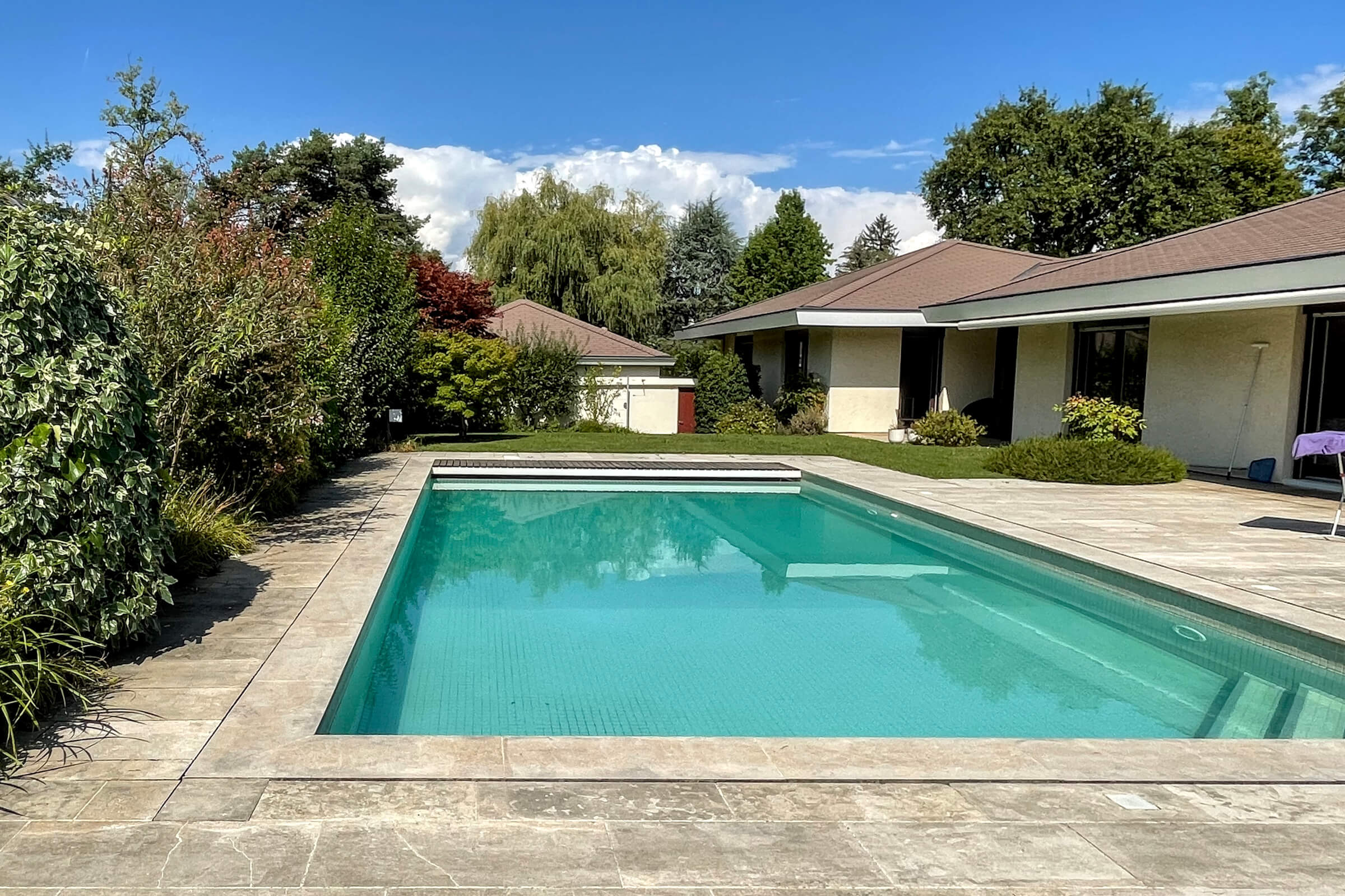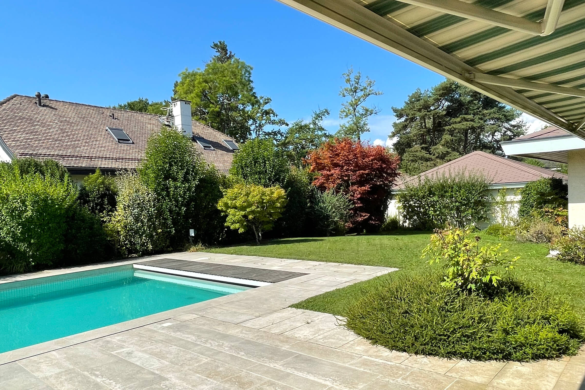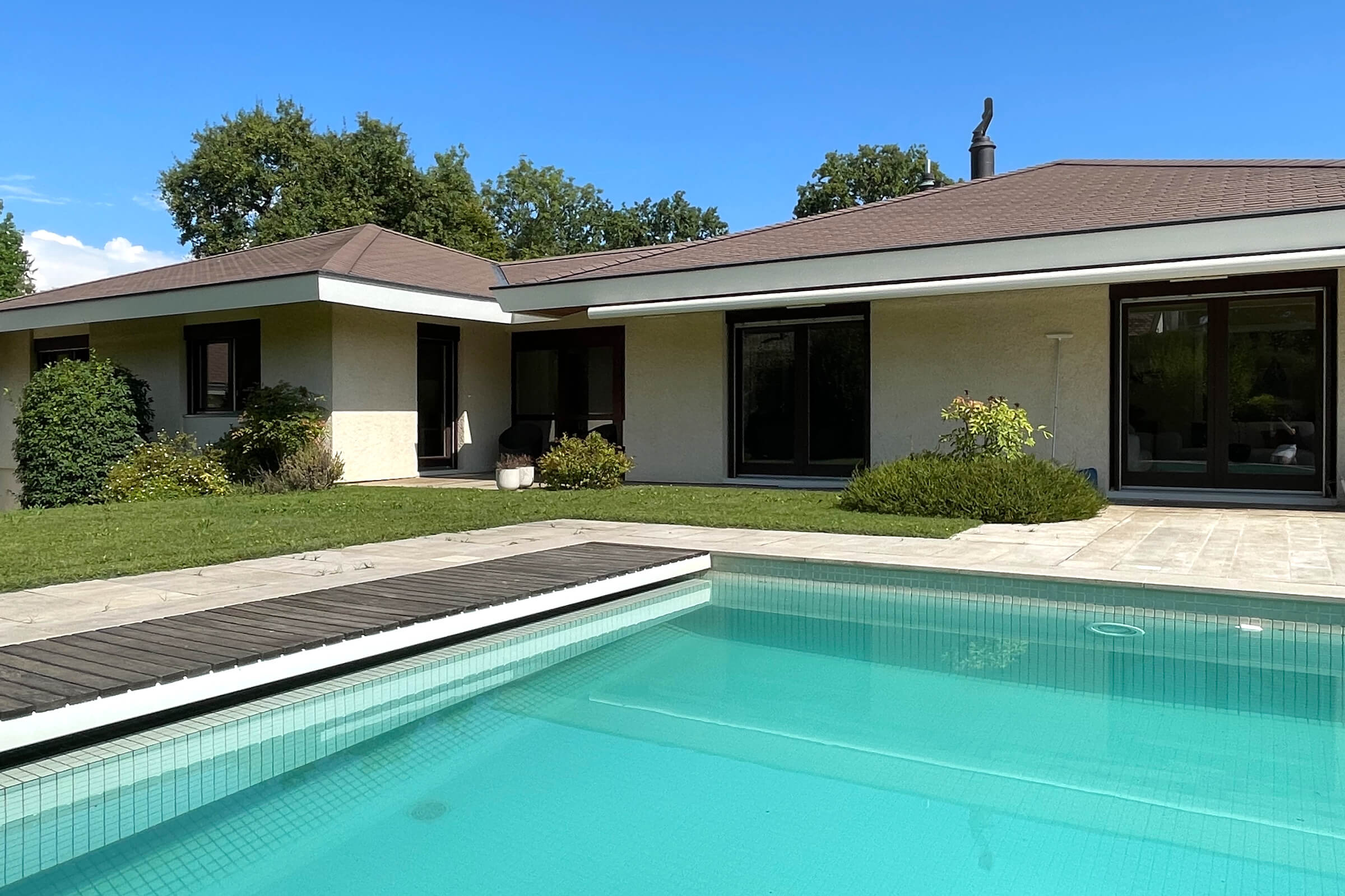 Pleasant single-storey villa dating from the end of the 1970s of approximately 450 sqm in total, located on a beautiful plot of 1398 sqm with a magnificent outdoor swimming pool, in a very quiet and residential area, close to all amenities and international schools 10 minutes from downtown Geneva.