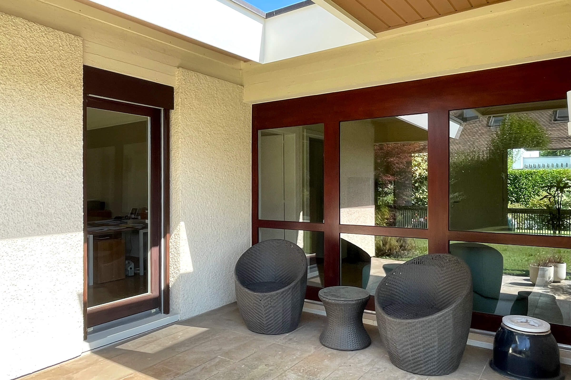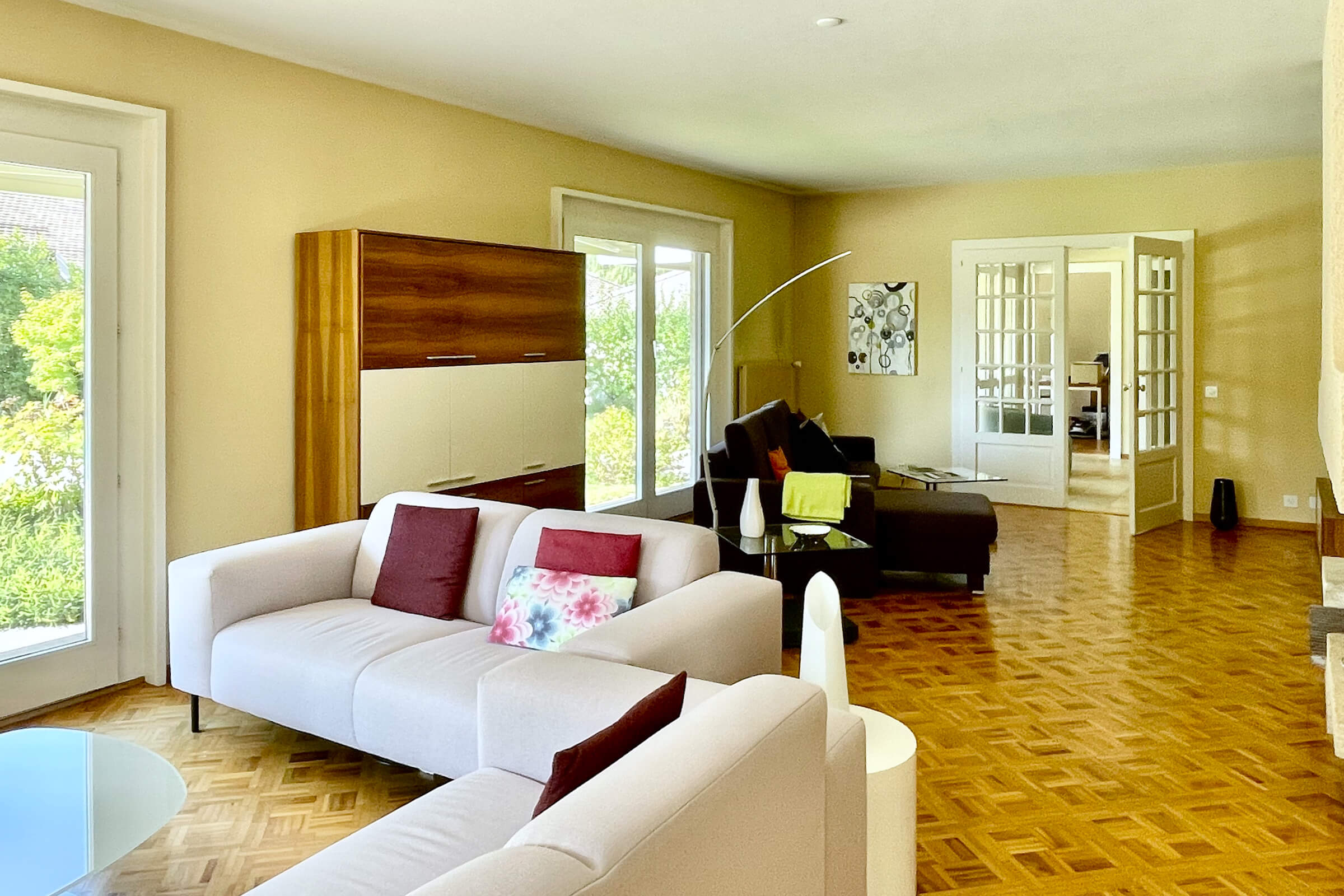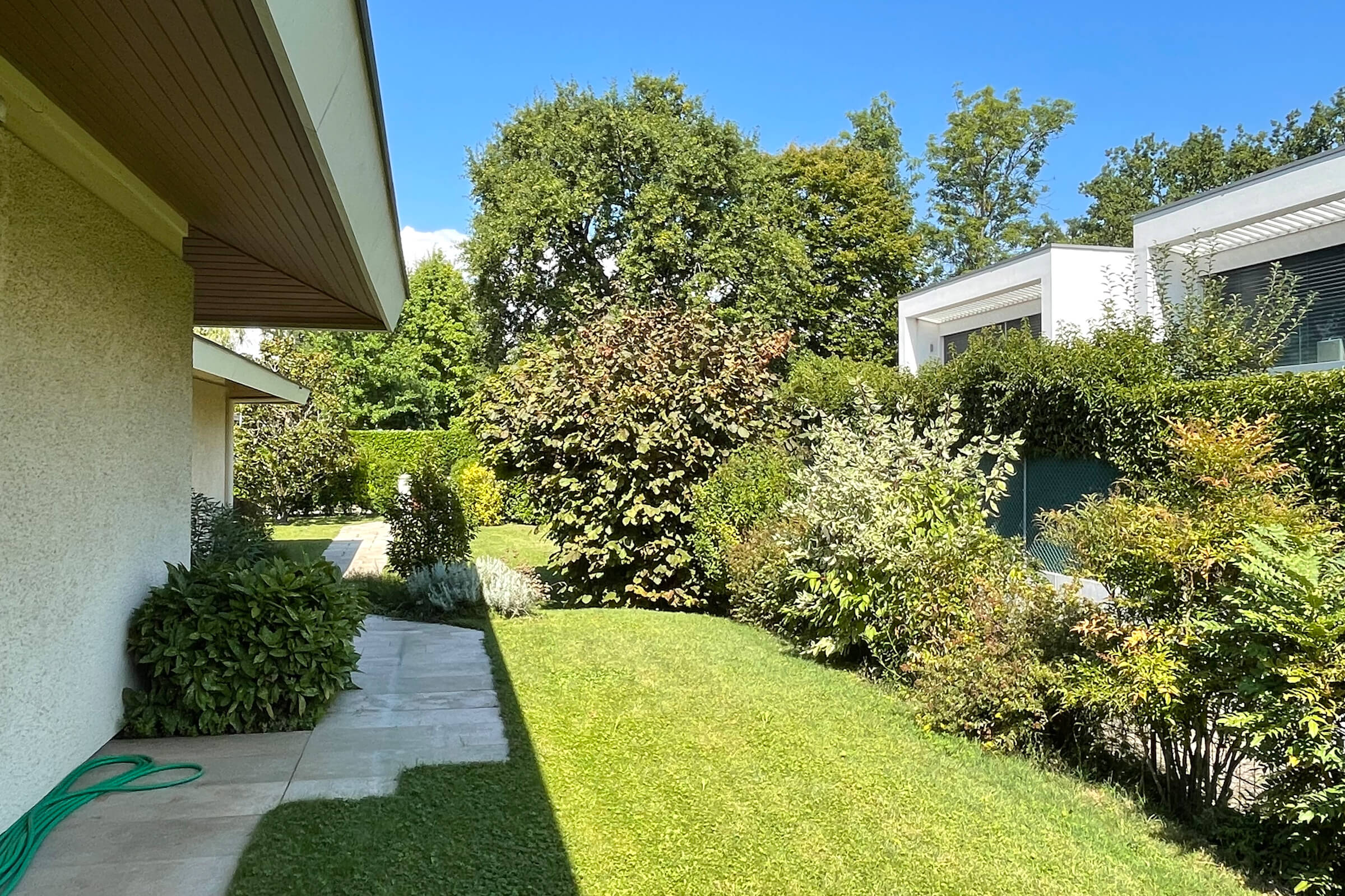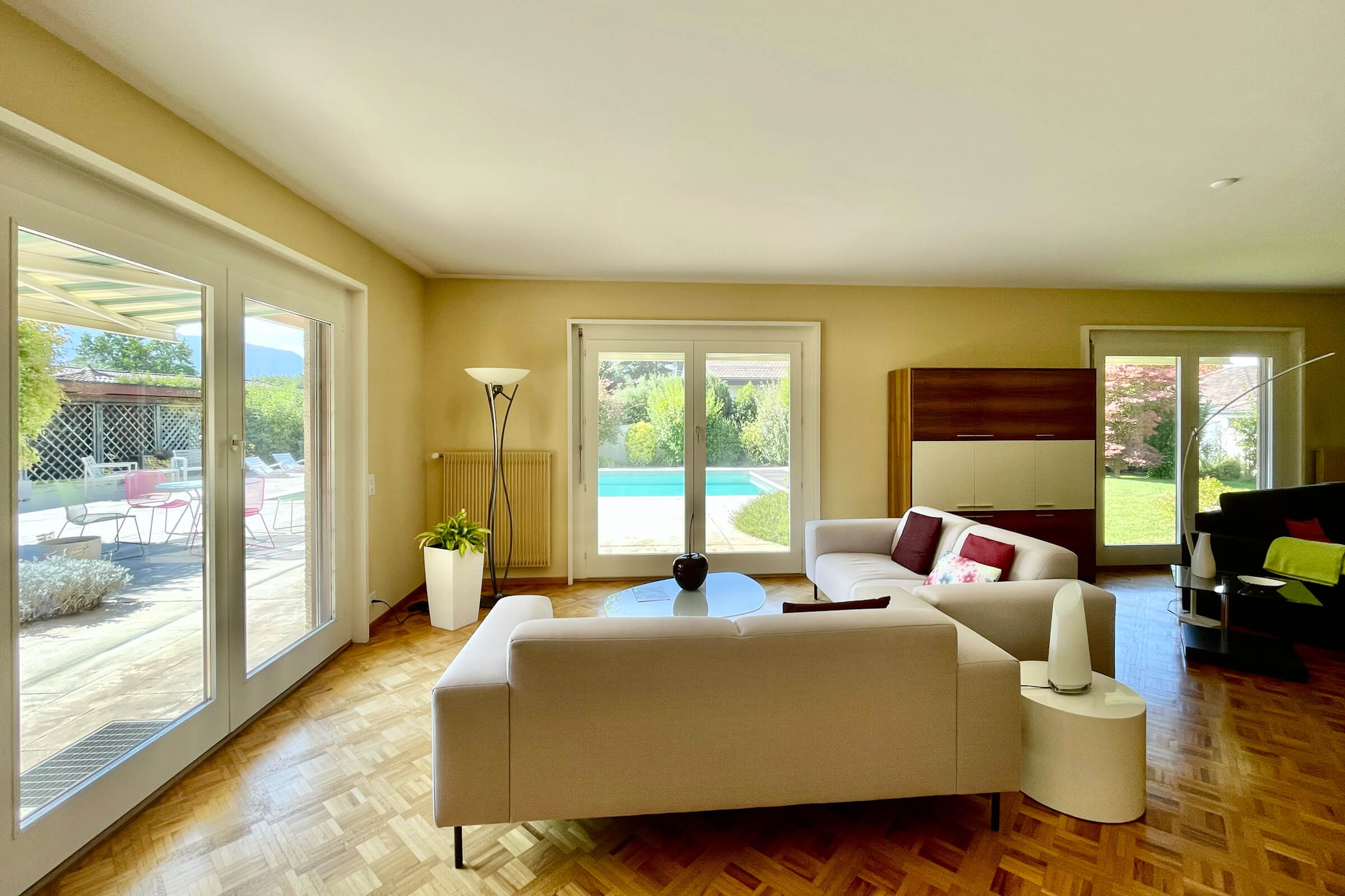 Pleasant single-storey villa dating from the end of the 1970s of approximately 450 sqm in total, located on a beautiful plot of 1398 sqm with a magnificent outdoor swimming pool, in a very quiet and residential area, close to all amenities and international schools 10 minutes from downtown Geneva.