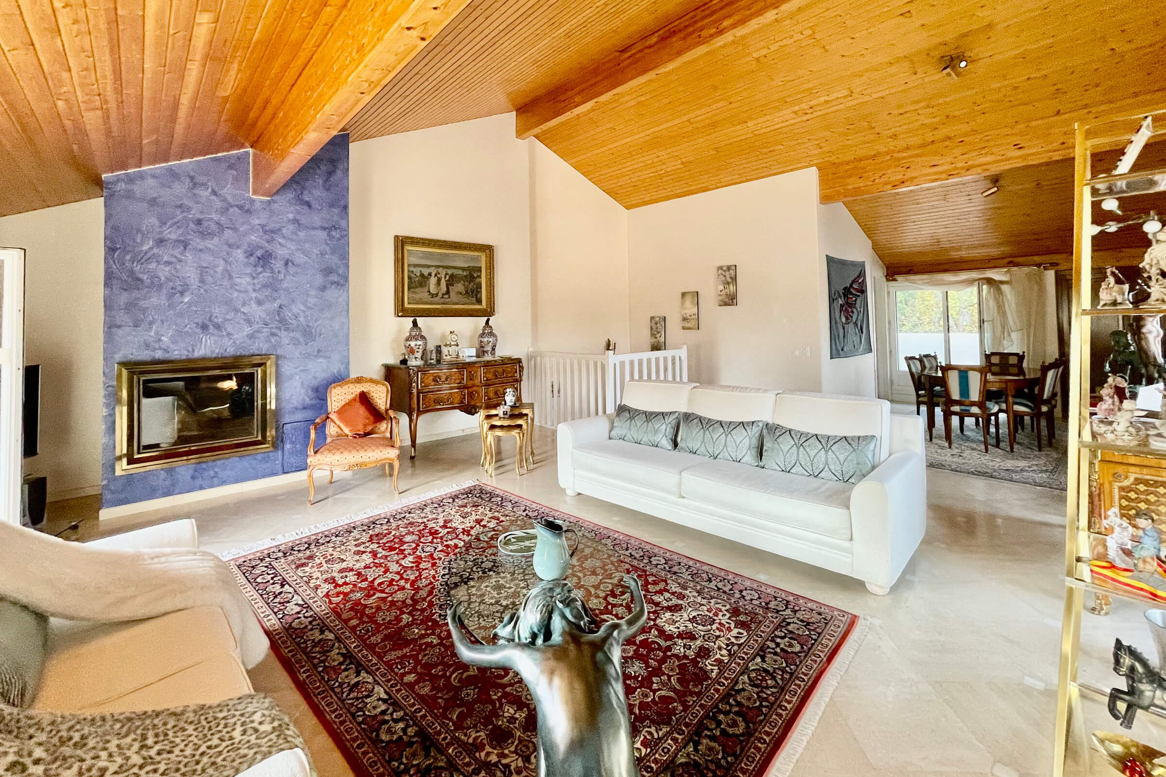 The upper floor offers a separate fully equipped kitchen, a dining room with balcony and a spacious living room with high ceiling of about 6m, with a fireplace, an office space, a TV area, all leading to a balcony overlooking the park and the unobstructed view.